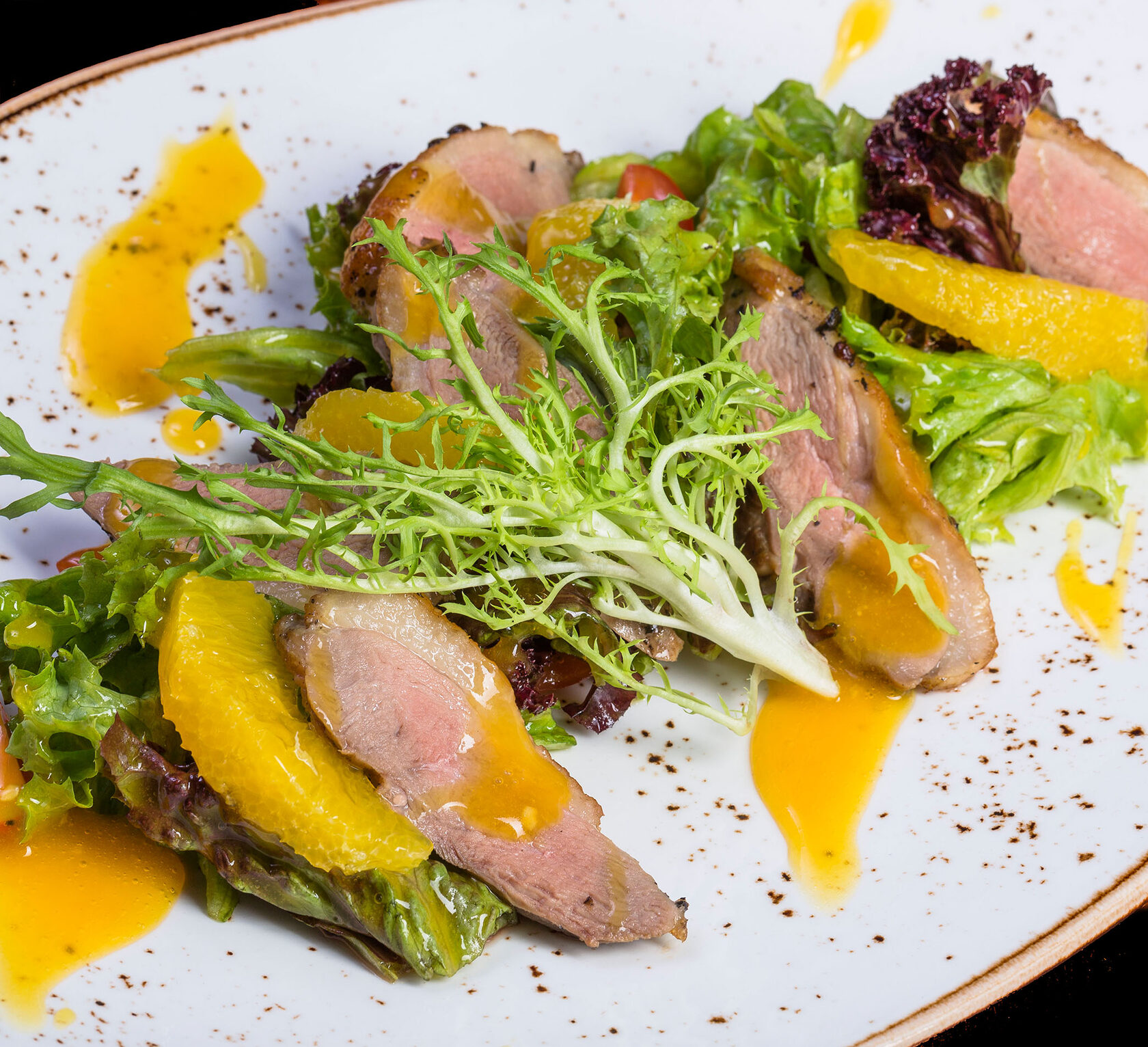 Утиная грудка, апельсин, соус маракуйя, листья салата