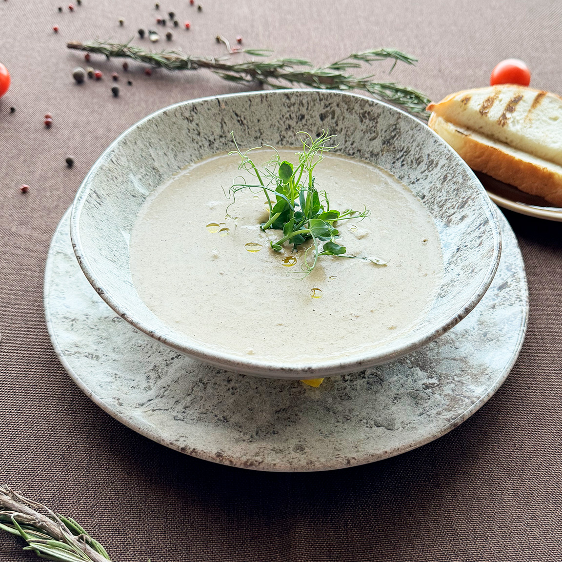 Борщ — это вкусовой эксплозив, где насыщенный багряный цвет сливается с многообразием ингредиентов, создавая богатый, утоляющий голод бульон. Каждая ложка — это праздник для вкусовых рецепторов, где мягкость овощей сочетается с глубокими нотками бульона. Хрустящие гренки добавляют текстурный контраст, а смалец вносит нотку деревенской сытости. Венчает всё это сметана, принося в борщ кремовую мягкость и легкую кислинку. Каждый компонент играет свою роль, делая блюдо неизменно утонченным и невероятно аппетитным.